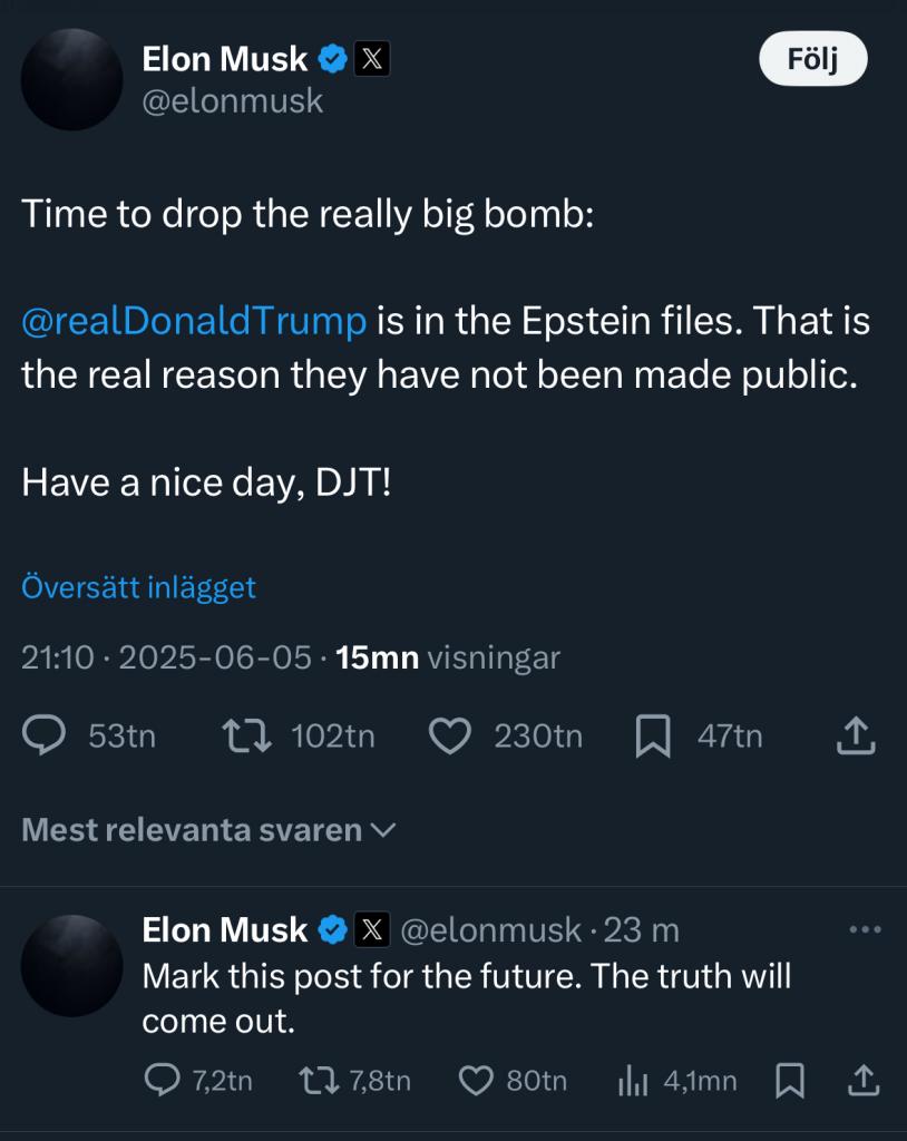 Det förutsätter att Trump är med i Epstein-filerna. Det kan också vara något Elon slänger ur sig i stridens hetta. Det är inte första gången han beskyller någon för att vara pedofil.