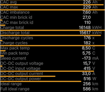 Fast i detta fall är det något som ej stämmer med batteriet, låg SOC 80% av tiden? Och kallt klimat? Borde ligga runt 90kWh?
