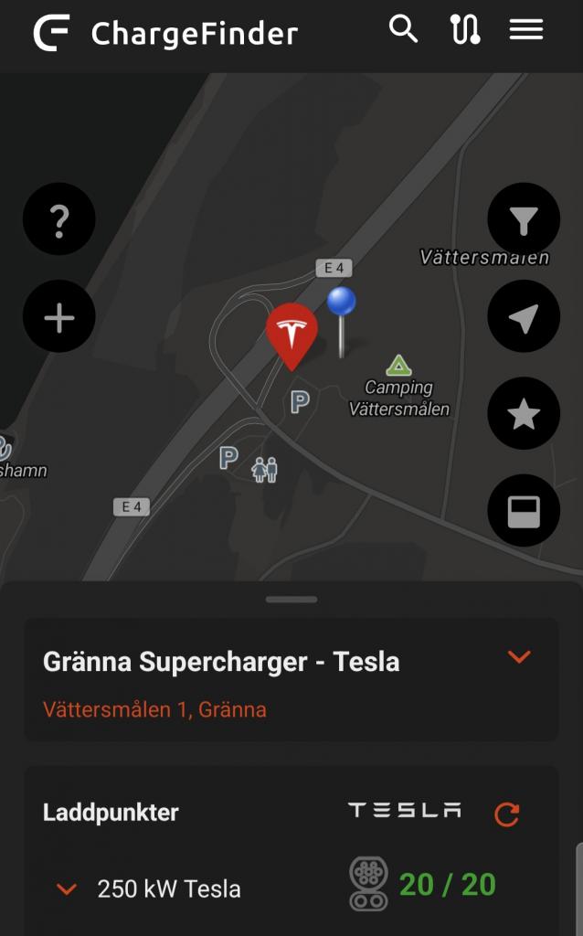 Lite märkligt att den inte dykt upp i Teslas app än. Ska ju vara öppen för alla elbilar enligt kartan på Teslas hemsida.