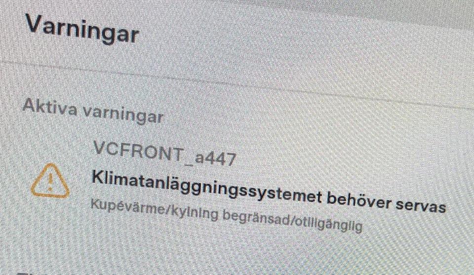 10 min efter laddning försvinner värmen och felkoden VCFRONT_a447 Klimatsystem behöver servas kom.