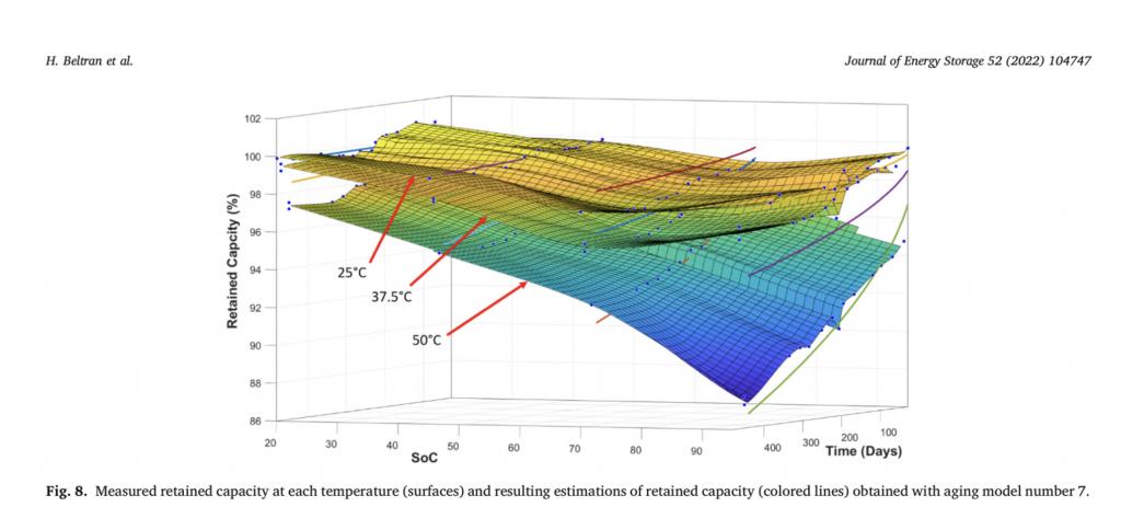 I de figurer du postat kan man använda temperaturen som proxy för tid, då en enda anledningen att calendar ageing är högre vid högre temperaturer är att kemiska reaktioner går snabbare vid högre temperaturer. Gör man det ser man tydligt att calendar ageing på sikt är klart lägre vid 80% SoC än vid 100%.