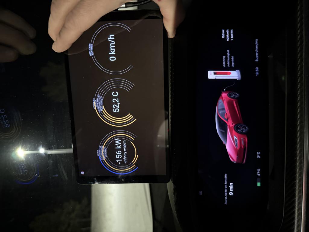 Vid närmare 50% när batterivärmen vart off en stund så gick 156kW in i bilen och, i vart fall avrundat, lika mycket in i batteriet.