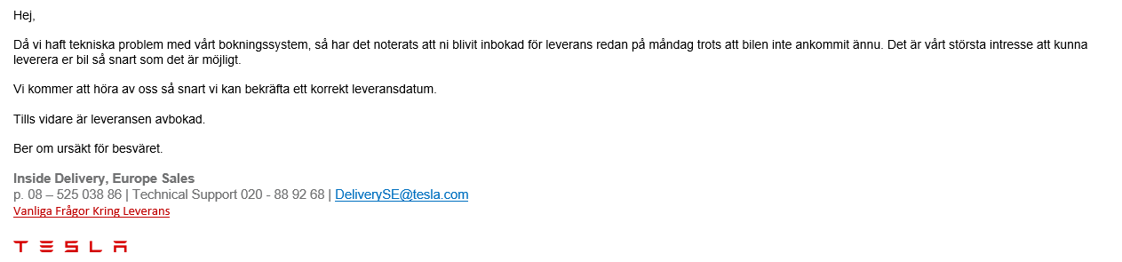 Är det någon mer som har råkat ut för bokad leverans med datum, plats och tid samt VIN-nr på hemsidan och sedan får ett mail enl bild om avbokad leverans och VIN-nr borttaget på hemsidan? :lol: