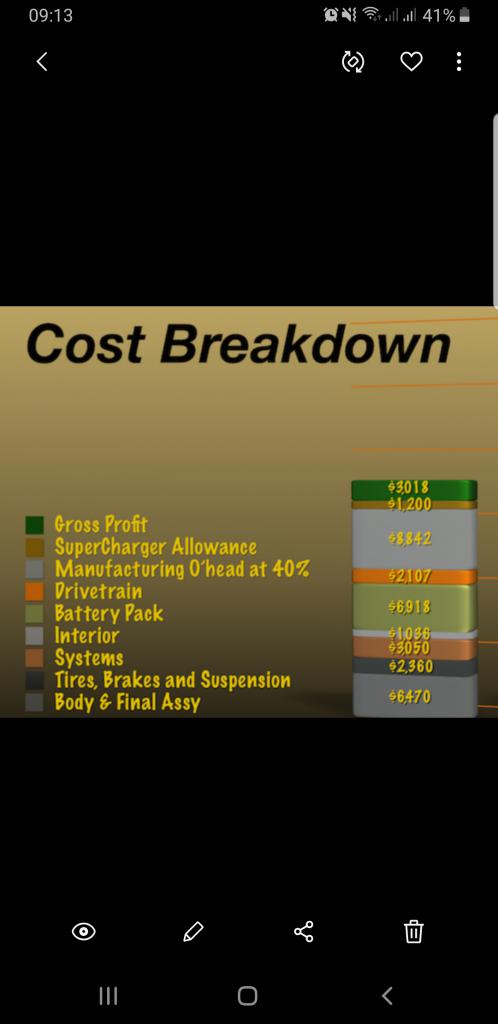 Däck, bromsar och hjulupphängning minskas med per enhet pga volymökningen/mängdrabatter. Sen kan ju även dessa delars priser pressas "frivilligt" av leverantören pga att Tesla nu som märke är bra att assossieras ihop med. Riktiga män/kvinnor väljer Perrelli, brembo, öhlins. Typ.