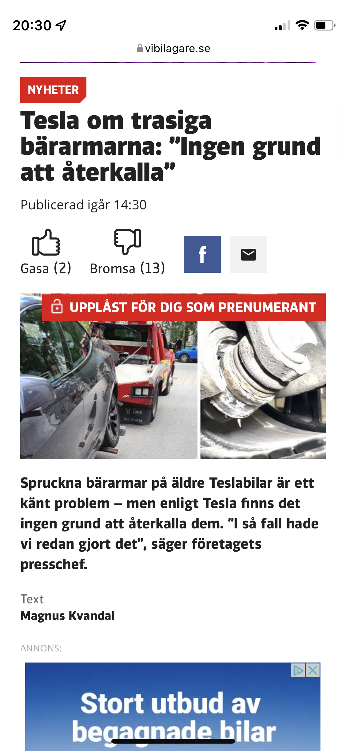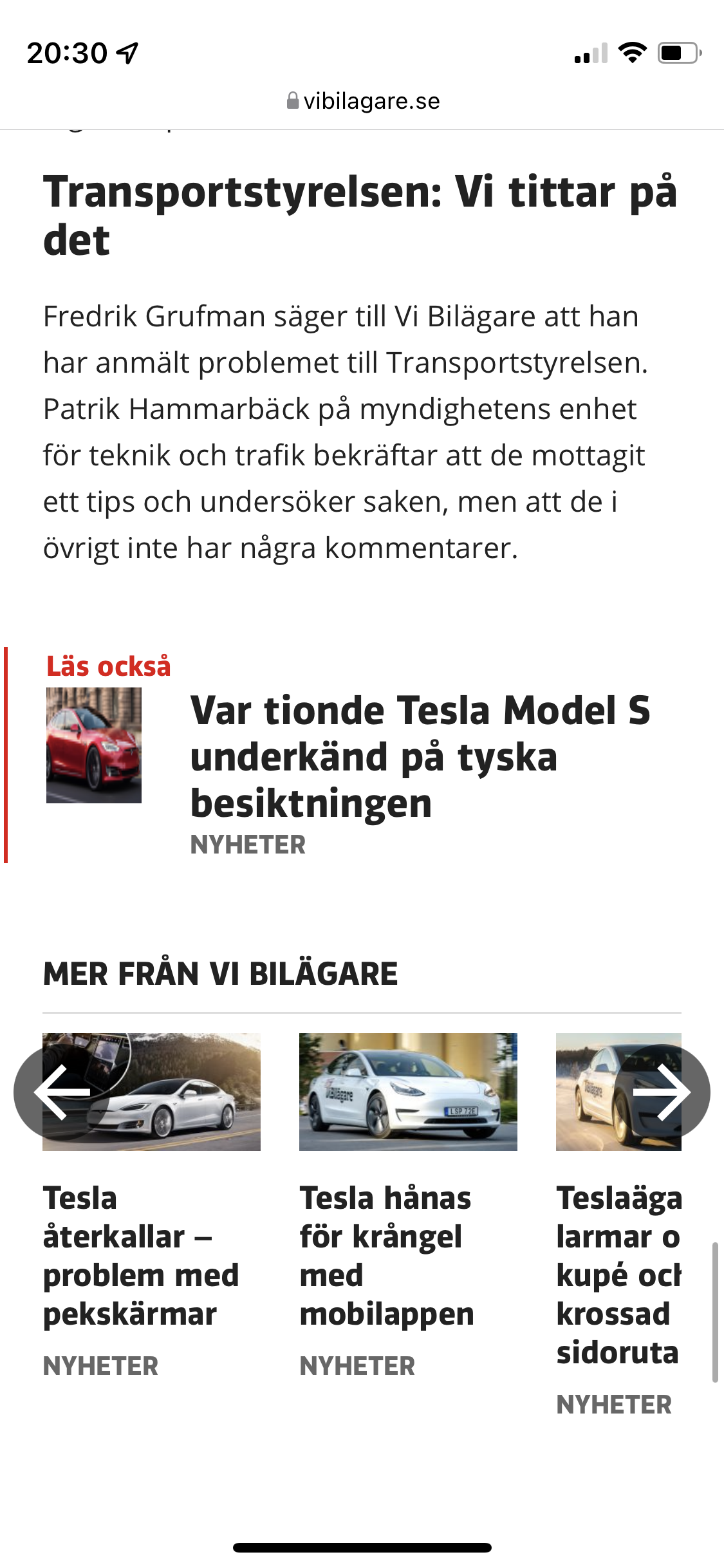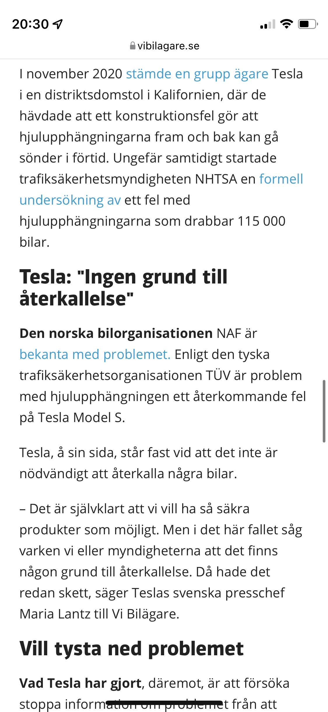 Som jag förstår det så uppgraderades den här komponenten ngn gång i augusti 2017. Och av bilar som byggdes innan ca aug. 2017 med den gamla komponenten, så har X% fått den utbytt av olika anledningar. Hur stor siffran X är har jag dock ingen koll på...MWall skrev:Fixades för flera år sen iofs. Men ändå illa.Nogo skrev:Är felet fixat till nya Model S tror ni? Man vågar ju inte köpa den nya för 1,55m om det är så här.
