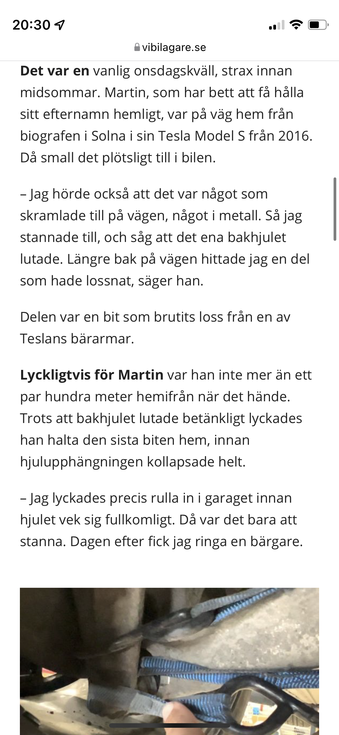 "Teknikens Värld har frågat Tesla Sverige om Tesla anser att länkarmsbrottet är slitage eller materialfel, men svaret bringar inte mycket klarhet.