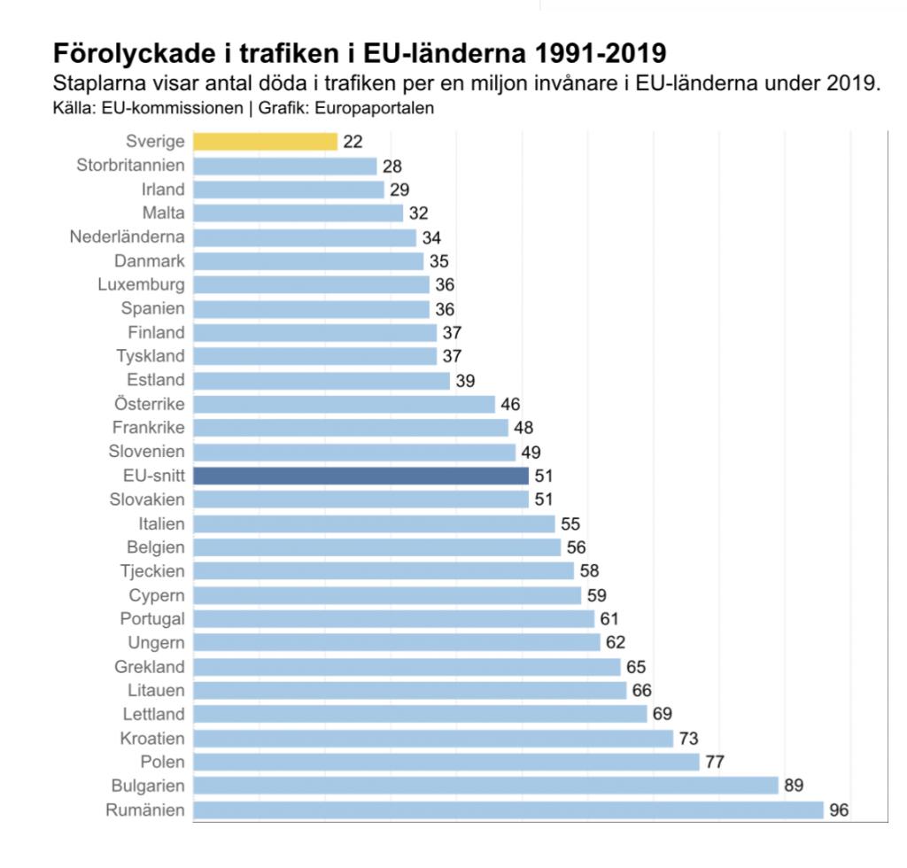 Alltså att svenskarna inte kör ihjäl sig i trafiken beror ju inte på de utomordentliga färdigheterna bakom ratten utan det beror helt och hållet på att det är så glest mellan bilarna och att man sänkt hastigheten till delvis orimliga nivåer, att vägarna är mötesseparerade, inhägnade och bredare än i något annat land i Europa.