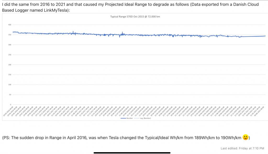 Här är loggade data från en snubbe som kört med 55% av samma anledning som mig sedan långt tillbaka. Snittet på Teslalogger.de påp s70d verkar ligga på ca 330km range.