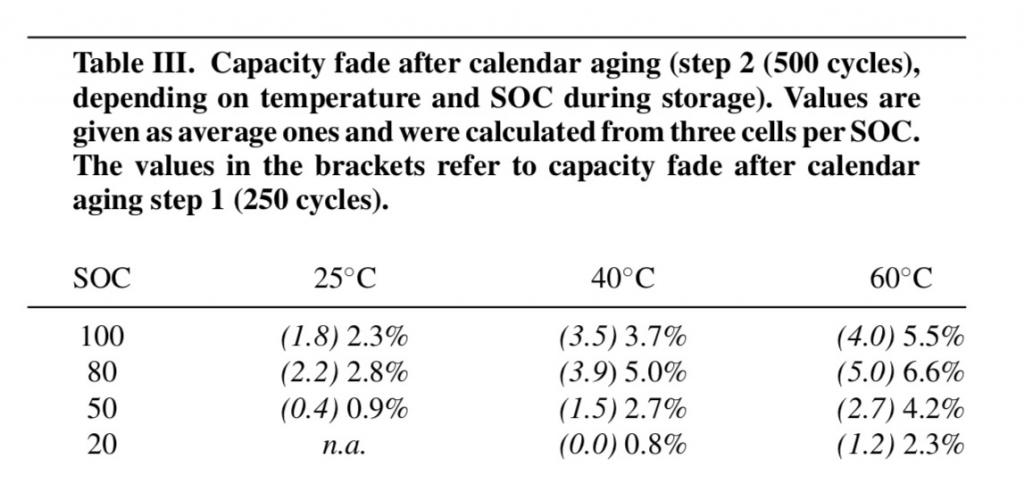Bilden visar att ~ 70-100% degraderar väldigt lika vid normala celltemperaturer (calendar aging).