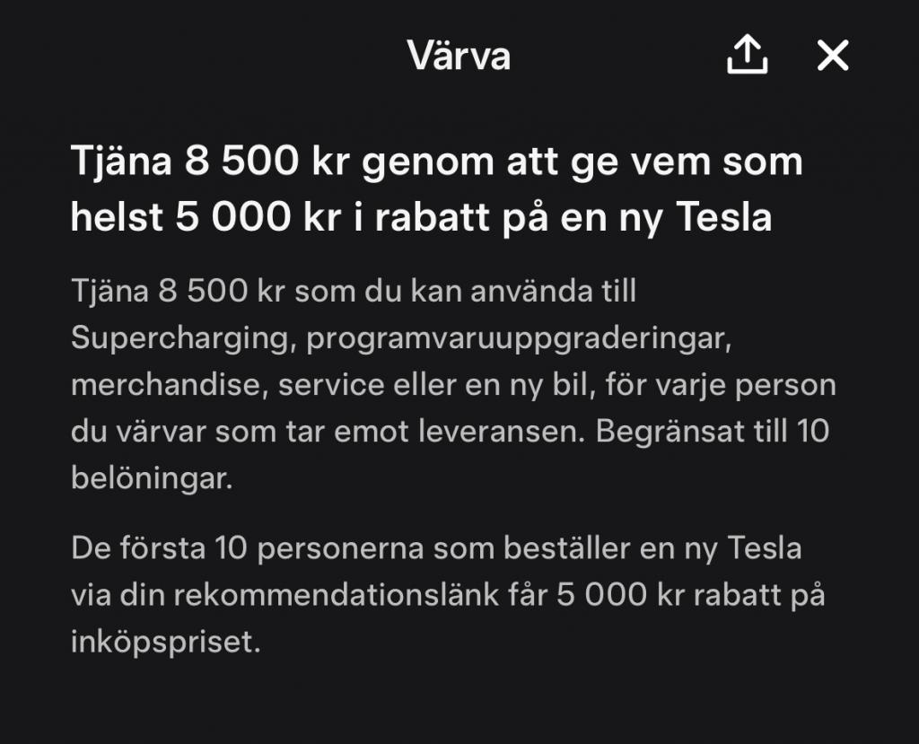 Som jag tolkar texten på https://www.tesla.com/sv_SE/support/refer-and-earn så kan du inte använda någon annans kod om du redan har eller har haft en Tesla, men du kan få lojalitetsbelöning genom att använda din egen.fth skrev: ↑19 nov 2024 16:10Men använder man någon annans kod så får inte den personen heller några poäng (enligt jonasl)?