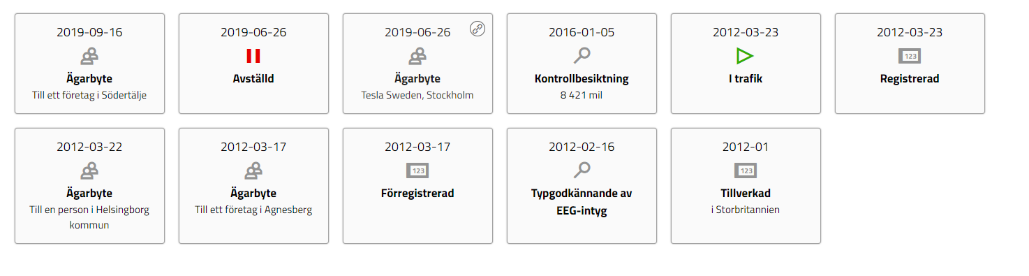 Det stämmer. Bilen har också haft regskylt EUFORI och är #8 i min sammanställning.Klintan skrev:Ja. H-O agerade ombud åt Tesla i Danmark om jag minns rätt, innan Tesla fanns i Sverige.bylund skrev:Vad innebär "svensksåld"? Att den inte var i trafik i utlandet innan den registrerades i Sverige kanske?