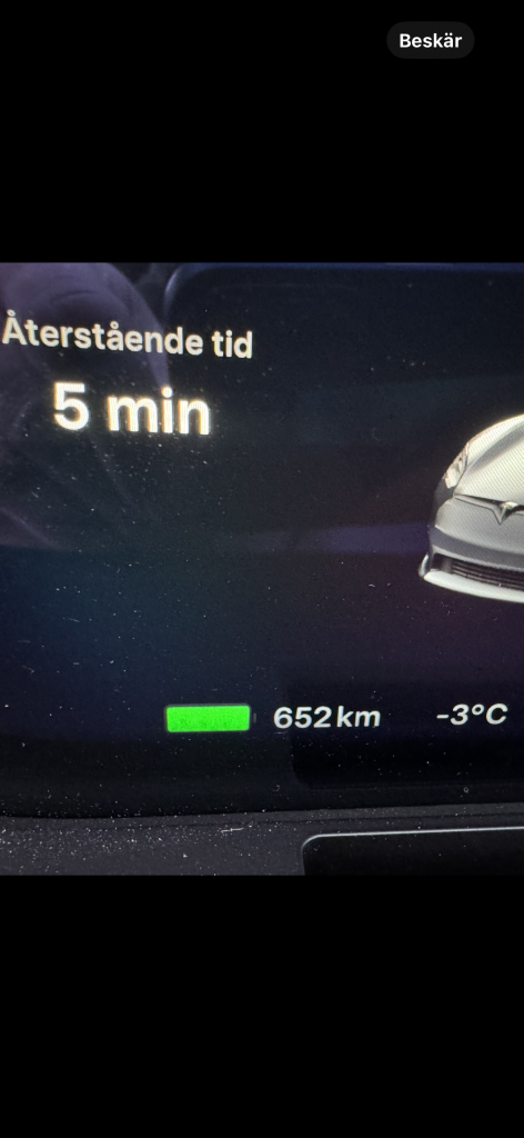 Laddade sent som vanligt + att jag värmde batteriet ytterligare med Plaid/Dragstrip mode med bilen inkopplad till ca 35C. Dragstrip mode brukar vilja värma batteriet till 42C, så det hade troligen gått att få i mer värmeenergi batteriet om man hade orkat.
