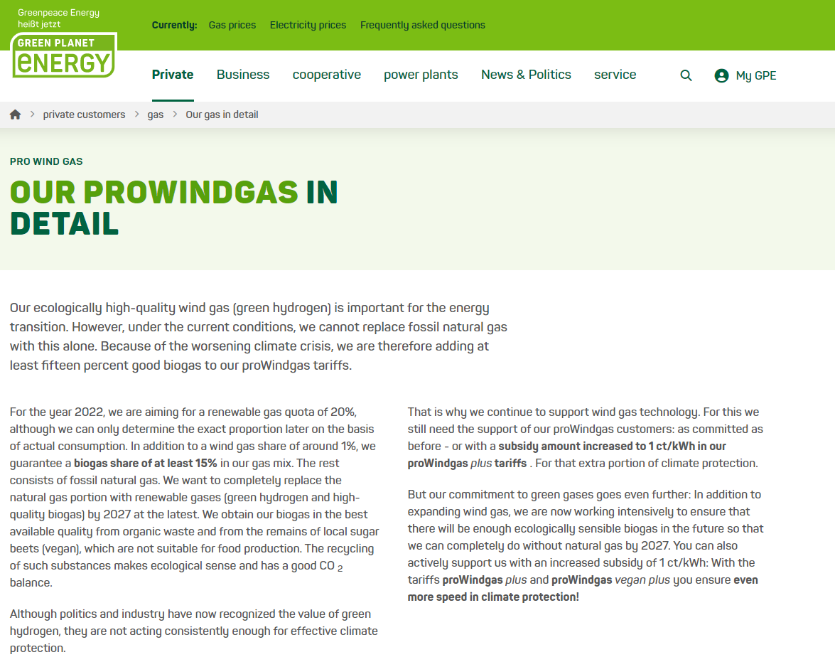 Greenpeace marknadsför samtidigt sin Prowindgas med 85 % fossilgas.