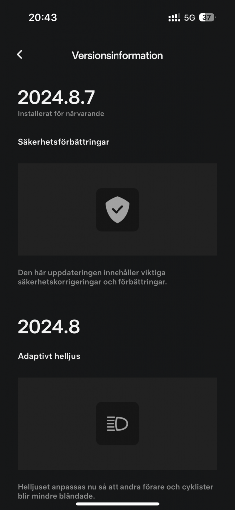 2014.8.7 är den nyaste, det ser inte ut att ske några installationer av något nyare.LarsaR skrev: ↑01 apr 2024 09:45Har också 24.8.7 och ett meddelande i appen om programvaruuppdatering. Dock är även det 24.8.7! I bilen finns ingen markering om att någon uppdatering finns att ladda ner, bugg?bjornnilsson skrev: ↑01 apr 2024 09:27Har 24.8.7 och besökte Norge en sväng i helgen. Där kom meddelande om att ny version kommit. Jag tänkte att jag laddar ner på mitt hemma-Wi-Fi när jag kommer hem. Uppdateringen låg därför i två dagar utan åtgärd. Väl hemma så är uppdateringen borta. Kan uppdateringar försvinna/tas bort? (Inget aprilskämt.)