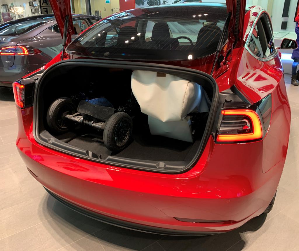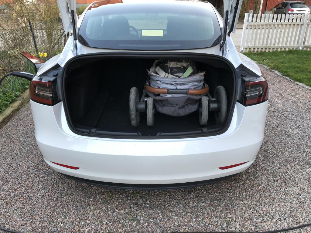 Det som fick oss att bestämma oss för en Model 3 var testet av vår Emmaljunga Viking. Jag hade länge tänkt att det bara var att glömma en barnvagn i Model 3 tills jag hittade en norsk tidningsartikel där en familj provar en "vanlig" barnvagn i en Model 3. Så vi åkte till Mall of Scandinavia och provade. Sittdelen fick till och med rum i underdelen om man vände sittdelen upp och ner. Kanske inte helt optimalt blöta dagar men visar på att det faktiskt kan fungera med en sedan och barnvagn. Sen är det ju ett stort plus i kanten att vissa hopfällbara sulkys går ner i frunken