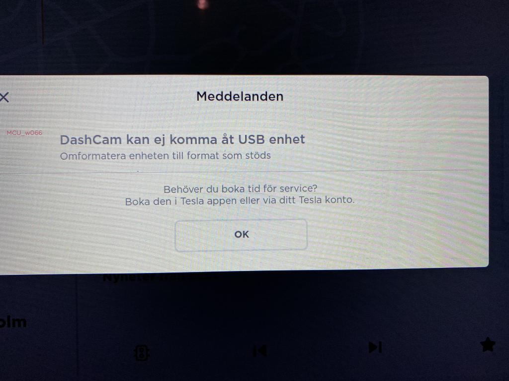 Det andra problemet är USB minnet som dashcam klagar på som full trots att det var bara 10% fullt (ny 128GB snabb USB) och testat en annan också. Sentry mode går att aktivera men inget sparas då det blir en en grå kryss i övre högra hörnet av ikonen.