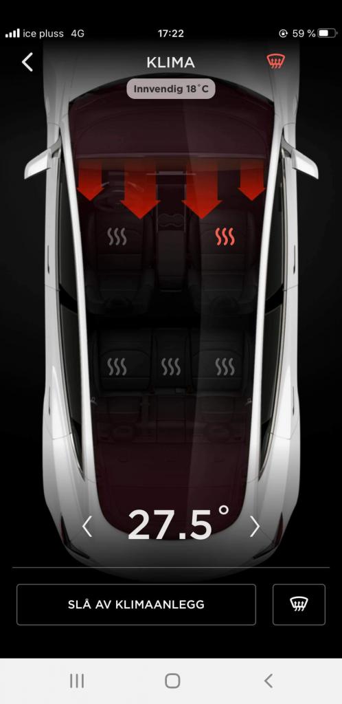 Håller med, det saknar jag verkligen. Känns märkligt att de inte ordnat den möjligheten. Jag brukar ibland ändra till det jag önskar sen trycka den tillbaka i Auto. Men det känns lite omständigt.martinot skrev:Jag brukar stänga av fotvärmeblåset, men det som är speciellt dumt på just Tesla är att detta inte går att göra, utan att man samtidigt också tvingas gå över till manuell fläkthastighet.flojon skrev:Upplever också problem med AC. Känns som det fortsätter komma varmluft vid fötterna även om bilen är tillräckligt varm för inställd temperatur. Blir rena bastun vid fötterna tillslut.