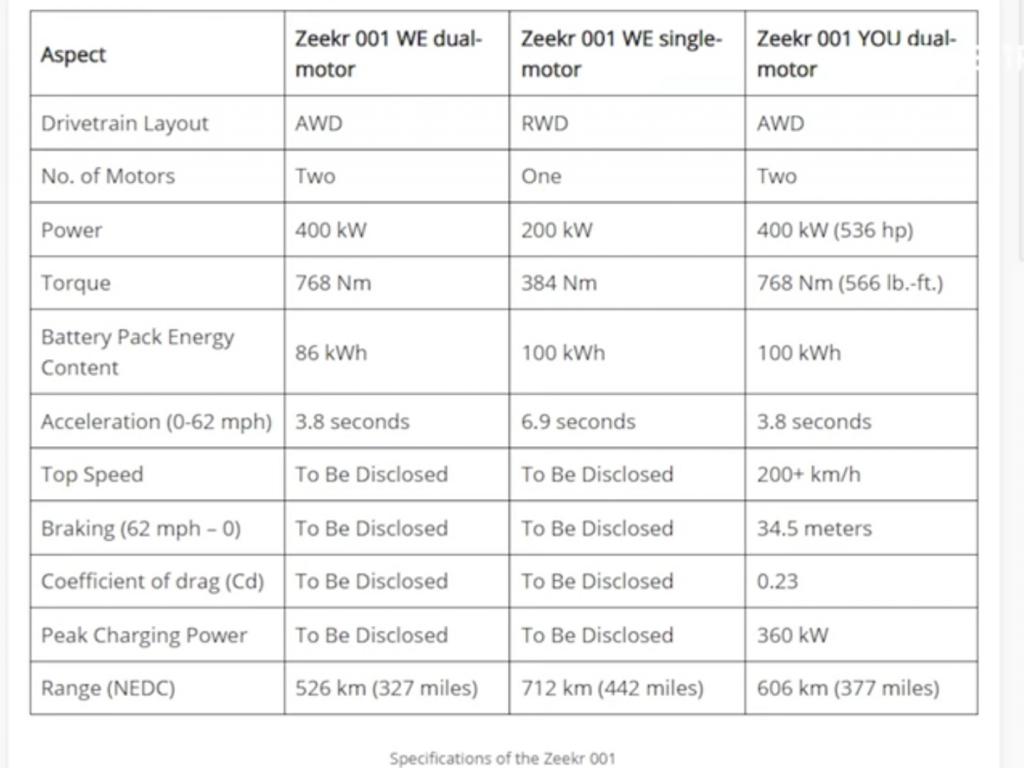 Zeekr 001 bygger på Geelykoncernens nya SEA-plattform som är helt anpassad för eldrift. Den får dubbla elmotorer och en räckvidd på ”över 65 mil”. 0–100 km/tim ska gå på under fyra sekunder.