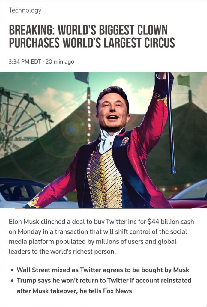 politiskt korrekt, köpt twitter, ett närmast clownlikt missköt företag."