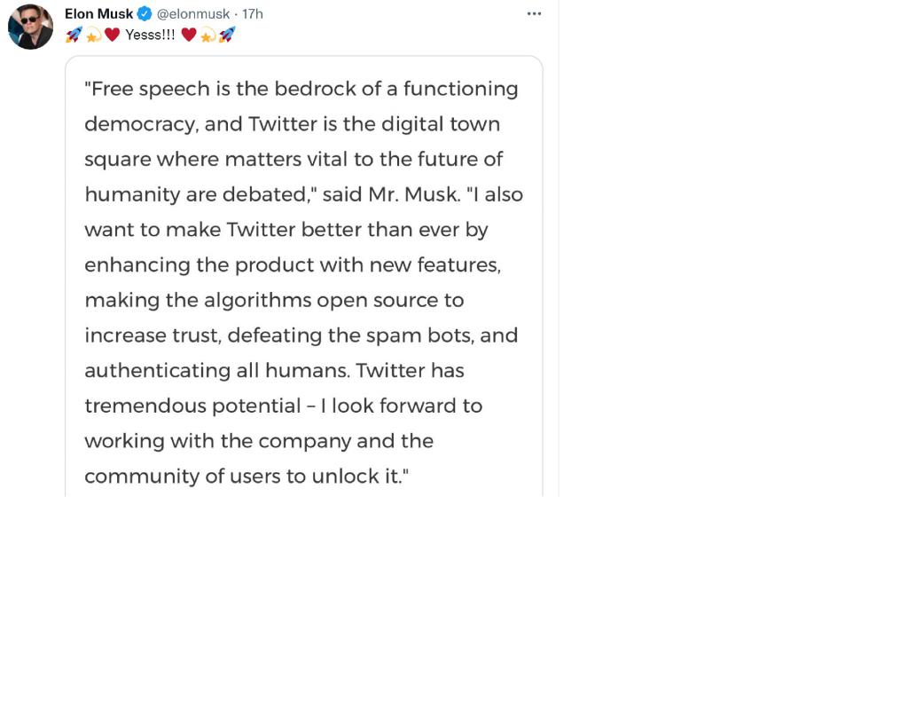Ska vi gissa att Twitter kommer börja filtrera bort kritik mot Tesla och Elon Musk och att Trump kommer återfå sitt konto när Elon fått igenom köpet?
