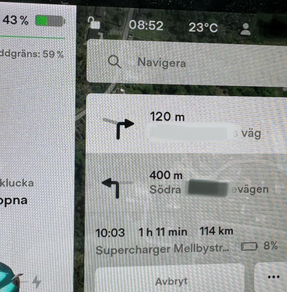 - Navigering. I standardvy så är den ju sämre och mindre pedagogisk än Google maps i en mobil. Det hade ju iof kunnat vara en lösning att bara spegla en mobil på skärmen, om nu Tesla hade haft Carplay... Det jag verkar få är en karta med en röd pil på och några små symboler uppe i hörnet. På en normal bil får man ju såna enklare pilar på en HUD men betydligt mer detaljerade bilder på en skärm. Jag har hittills lyckats köra fel flera ggr på grund av att den inte visar vilken fil jag behöver ligga i. Det går ju att zooma in men den zoomar ju tillbaka snart, eller så slutar den följa mig.