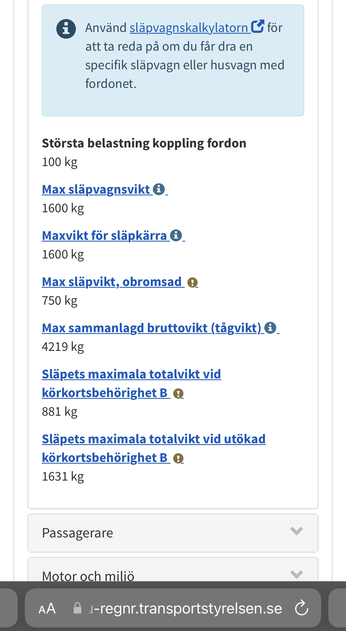 Jag utgick från min egen MYP som får dra ett släp med totalvikt på 866 kg. Sedan krävs utökat B för att dra tyngre.La_Jungla skrev:Blir lätt snurrig i huvudet när det talas om slävagn och maxvikter... Men om jag tolkar det rätt så betyder totalvikt i detta fall att släpet väger 550 kg och du får lasta 450 kg. Om din Model Y har en totalvikt på 2 405 kg(?) så borde du få lasta fullt - alltså 450 kg. Däremot om släpet hade vägt 1 000 kg och du fått lasta 450 kg så hade du nog varit tvungen att ha BE-behörighet få att köra med släpet - lastat eller ej. Tänker jag rätt?