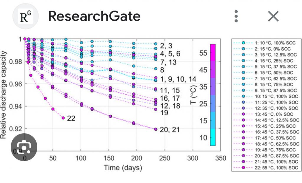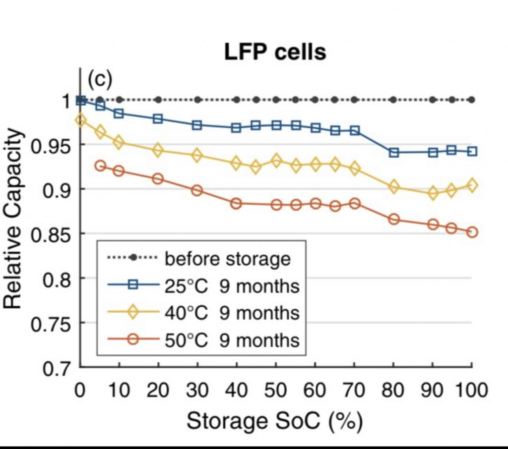 Calendar aging är lägst vid 0% för i princip alla lithium-kemier.