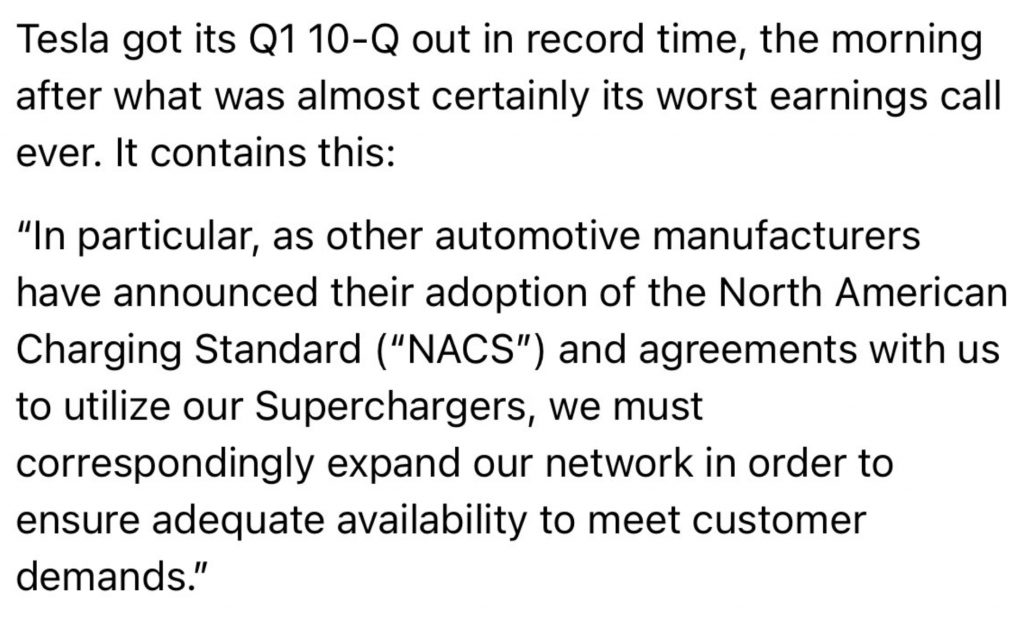 Den andra delen är att SC behövdes för att kunna sälja bilar men är inte jättelönsam i sig. Snarare en risk för reglering om man blir för dominerande. Antagligen bättre att låta konkurrenterna bygga ut lite mer, speciellt med tanke på att plug and charge kommer och man kan ladda en Tesla hyfsat bekvämt framöver.