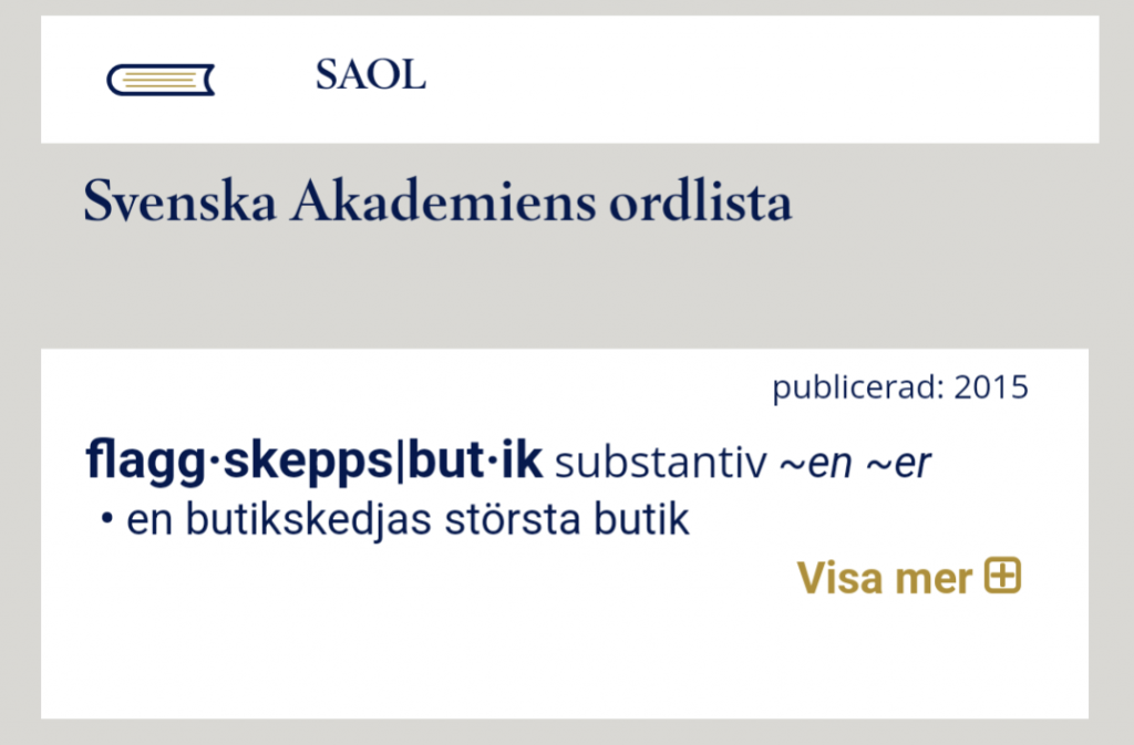 Flagship Store -> flaggskeppsbutik. Problemet för mig blir om man tänker "vinbutik", "klädbutik", "flaggskeppsbutik". Flaggskepp har inget att göra med butik i svenskan och en flaggskeppsbutik blir då en butik därman säljer flaggskepp.Verdi_ skrev: ↑08 maj 2024 12:06Fast flaggskepp och flagship har väl samma betydelse? Eller är det något som försvinner i översättningen som jag inte begriper?spacecoin skrev: ↑08 maj 2024 11:22Ja, jag vet att ordet finns i SAOL. Det är strykfult och tråkigt förfall av svenskan i alla fall i min mening.