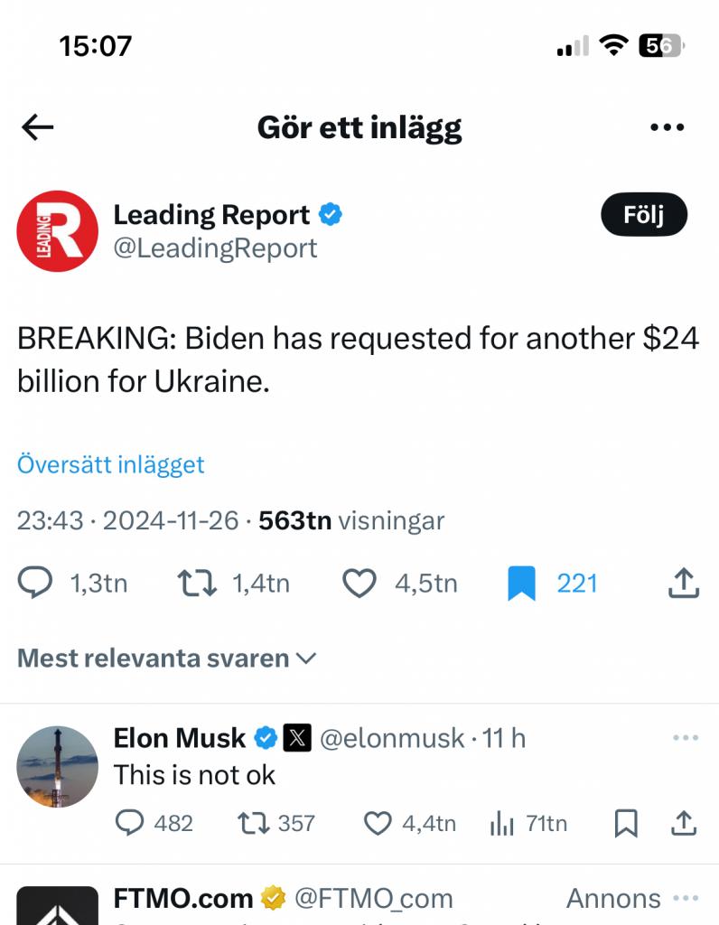 Konstigt att skriva "fortsätter att stötta Ukraina till 110%" vad gäller Elon eftersom han senaste året aktivt har lobbat mot alla stödpaket till Ukraina.Freez skrev: ↑28 nov 2024 19:41Det var en del av agendan absolut med det handlade även om handel och samarbeten. Min take är att många inte bara Elon var naiva innan invasionen. Framtiden får utvisa hur Elon/Trump kommer agera januari 2025 men jag hoppas så klart att man fortsätter att stötta Ukraina till 110%.Fredrik j skrev: ↑28 nov 2024 18:09Är ingen fan av Stefan Löven men syftet med det där mötet hos putin var ju för att protestera mot ockupationen av Krim samt upprepade kränkningar av svenskt luftrum.Freez skrev: ↑28 nov 2024 16:48Världen har förändrats, det var på den tiden Stefan Löven åt middag med Putin och inte ville vara med i Nato.