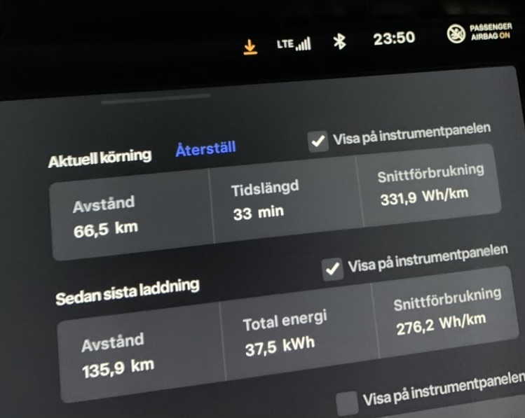 Model X 90D sedan månadsskifte okt/nov 650 mil vinterdäck 19 tum 240 wh/km