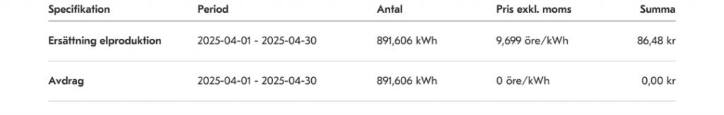 Jag fick 9,69 öre i ersättning per kWh av Bixia i april, totalt 86 kr.