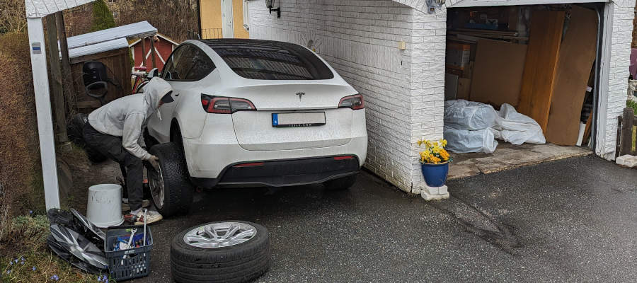 Efter genomförd däckbyte ska man på de flesta bilar gå in i menyerna och berätta för färddatorn att du har bytt däck. På Teslornas mittskärm finns inställningen under Service, Hjul och Däck.