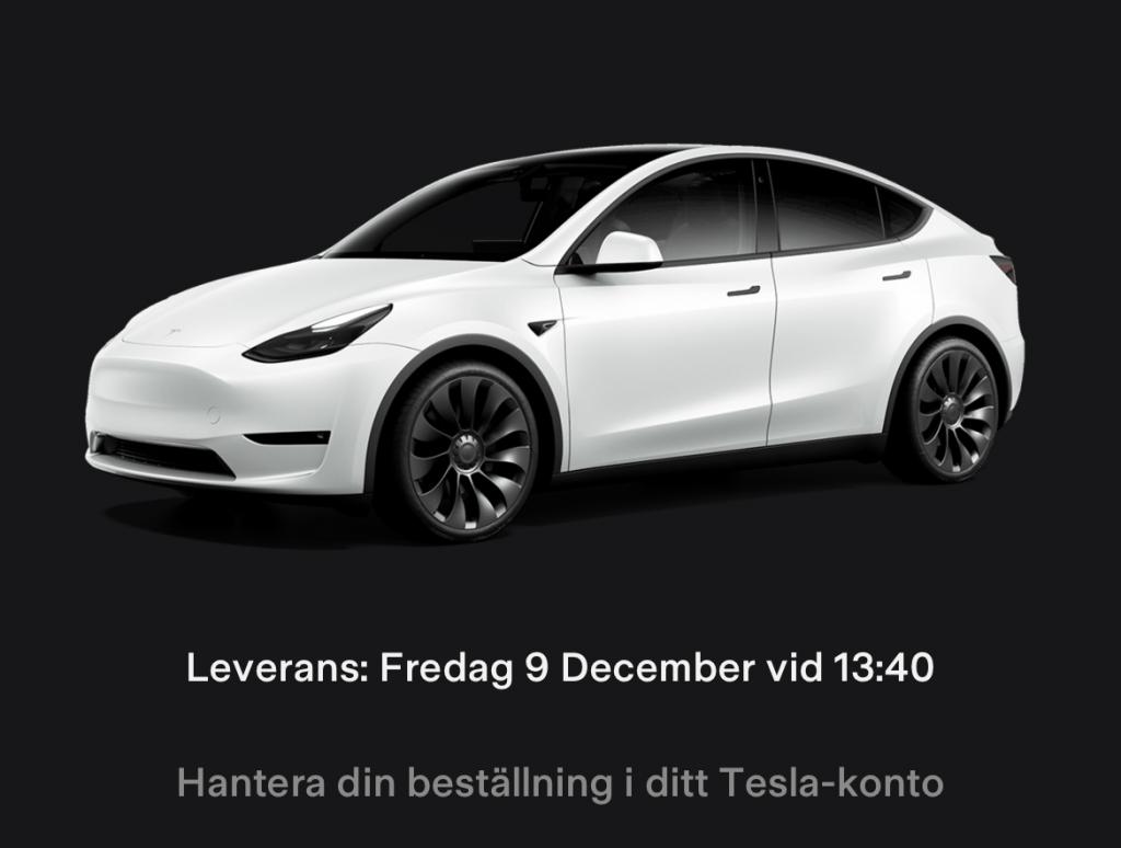 Vart ska du hämta?Sven1231 skrev:beställde den 24 sept en myp sv/sv, vinterdäck, uppgraderad autopilot rn1179. hade intervall dec-feb vid beställning, tesla ringde idag och frågade om jag är redo för lev i december då den med största sannolikhet kommer då. trevligt!