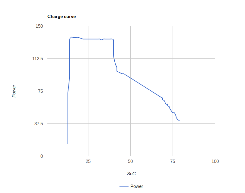 Utan att ha bevis, i form av en lika föredömlig graf, skulle jag nog påstå att precis sådär ser min laddkurva ut nuförtiden också. Det går fort uppför men hastigheten upprätthålls bara under en kort(are) period. Vad det gör för total res-/laddtid under en längre resa (typ alperna) har jag svårt att ha en uppfattning om .....