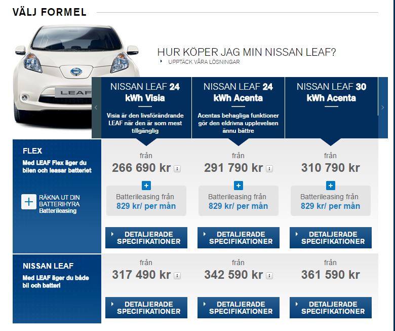 När jag går in på nissan.se och konfigurerar står det äga bil och batteri från 310 000 kr.apkungen skrev:Nybil kostar från 360kkr. det du räknar på är att du leasar batteriet. Du behöver lägga på kostnad för däck. Seervice? Försäkring? Nått mer?