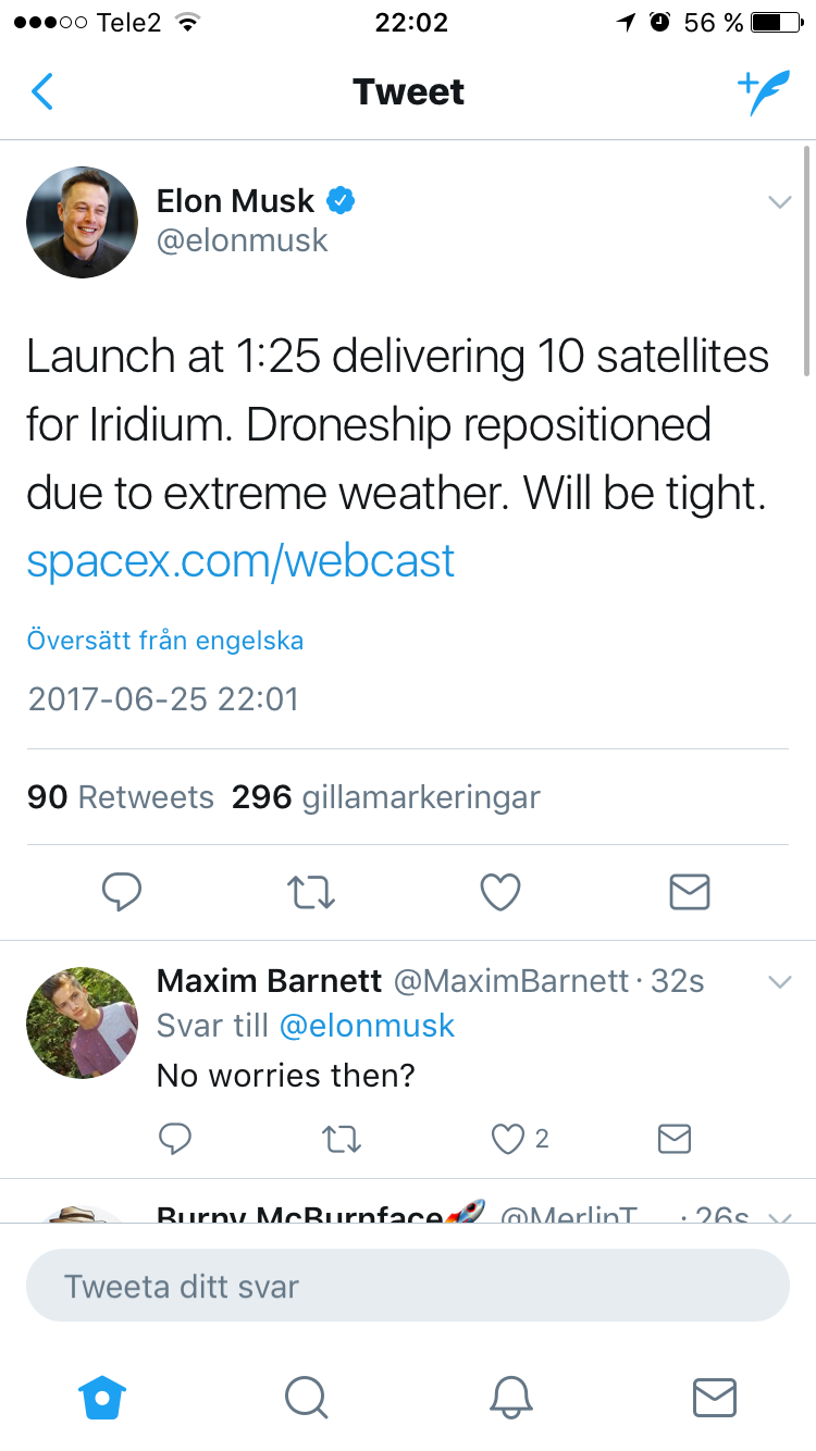 Om tolv timmar vid 22:25 så ska SpaceX skjuta upp ytterligare 10 satelliter av de 75 satelliter som Iridium vill ha upp för att skapa en konulitation av satelliter runt hela jorden. De ska inte återanvända första steget denna gången och landningen ska ske på Just Read The Instruction då uppskjutningen sker i Kalifornien.