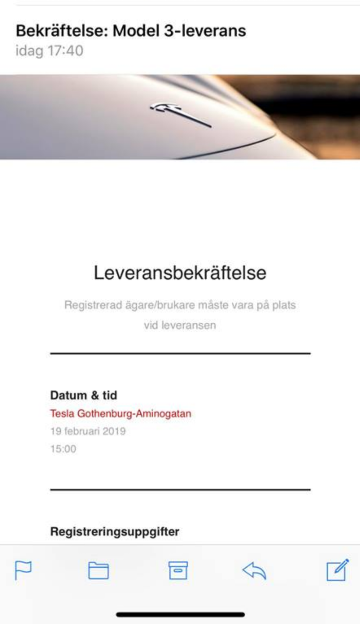 Nu har det även kommit Mail från Tesla som bekräftar leveranstiden den 20/2 klockan 09:00