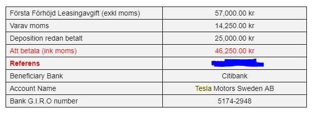Dagen innan leverans fick jag ett mejl från Tesla med uträkning om hur mycket jag skulle betala in till deras bankgiro. Där hade dom specat upp ffh+moms-25tkr.