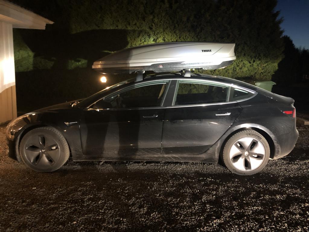 Hittade även denna video på en Tesla takräcksinstallation där en Thule takbox sätts på i slutet av filmen. Finns även en del 2 av videon där förbrukningen analyseras (utan takräcke, enbart takräcke, takräcke + takbox).