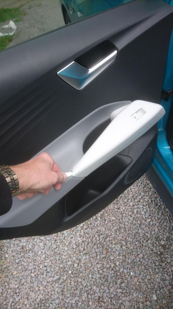 Fortsätt över kanten, samtidigt som du drar det ut från panelen. Var försiktig så du inte slinter och repar något. Detaljen sitter dels med plastflärpar (är det rätt ord?) runt om och dels med stålclips i mitten. Clipsen blir kvar i handtaget och flärparna är integrerade i delen som skall av. Ta det lugnt och jobba med verktyget samtidigt som du drar detaljen ut, försök att inte bända för mycket.