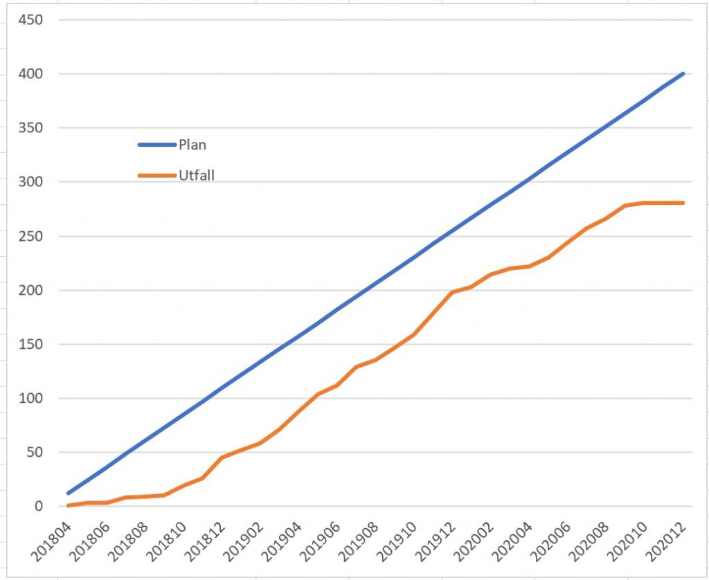 Om man skall tolka grafen så är de 6 månader efter plan (förutom att de verkar legat av sig på slutet).