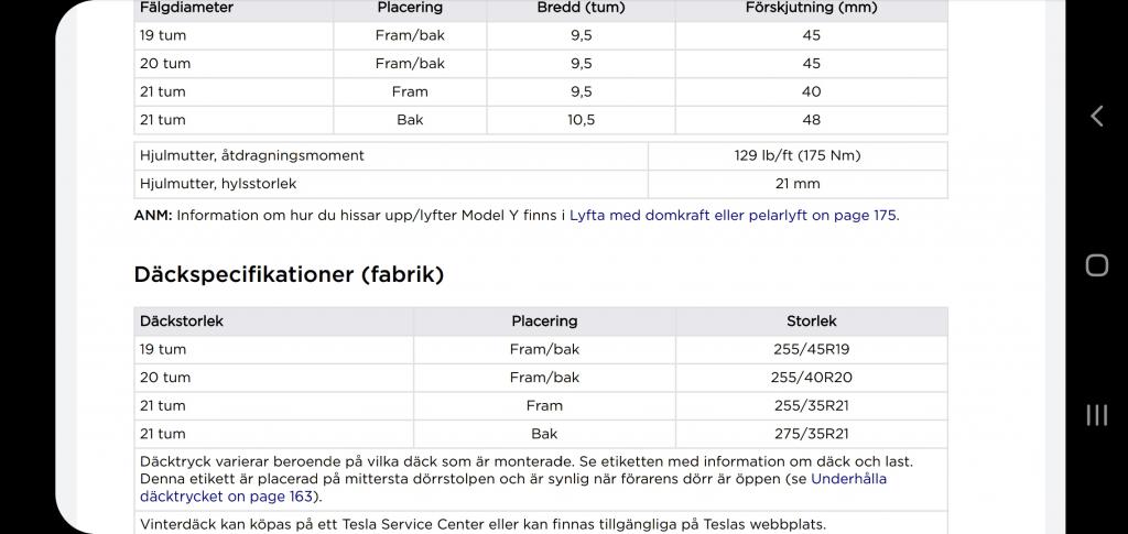 Det verkar vara samma diameter på bromsskivorna, och det står inget om krav på speciella hjuldimensioner för Performance. Notera att för 21" skiljer bredden mellan fram och bak.lakke skrev:storlek på fälg? och vilka däck är det?fnw skrev:Jag har aldrig köpt en ny bil förut men nu har jag beställt en MY för leverans i september. Tesla vill ha 30tkr för vinterdäck på fälg och jag tycker det låter lite… dyrt. Vad kan man köpa om man vill ha bra grejer men utan att det kostar skjortan?