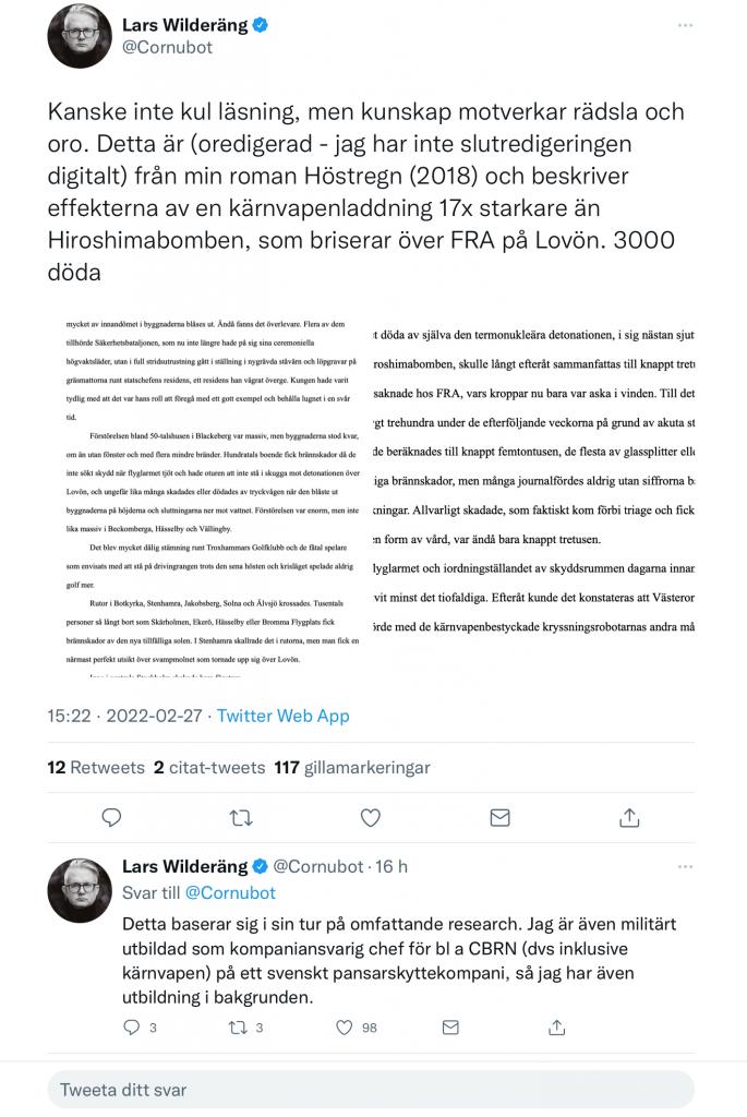 Jag ser inte heller något direkt samband där. Ett inte helt osannolikt scenario är i min uppfattning att Putin skickar en taktisk atombomb till Kiev. Därmed är staden platt och han har uppnått sitt mål, han har typ "vunnit". För det är ju allt det handlar om. Men det blir ingen jättestor påverkan för omgivningen. Däremot så kommer naturligtvis diskussionerna igång om att släppa restriktionerna mot Ryssland, han har ju visat vad han är kapabel till. Ingen vill stå näst på tur. Jag skulle kunna tänka mig att det är så han resonerar. Jag tror ärligt talat inte längre att hotet är en bluff.LarsL skrev:Varför skulle Putin och Ryssland få atombomber på sig om de väljer att bomba oss eller Ukraina? Ingen av oss är med i NATO så de inte komma till våran undsättning och därmed själva bli mål för bomber.