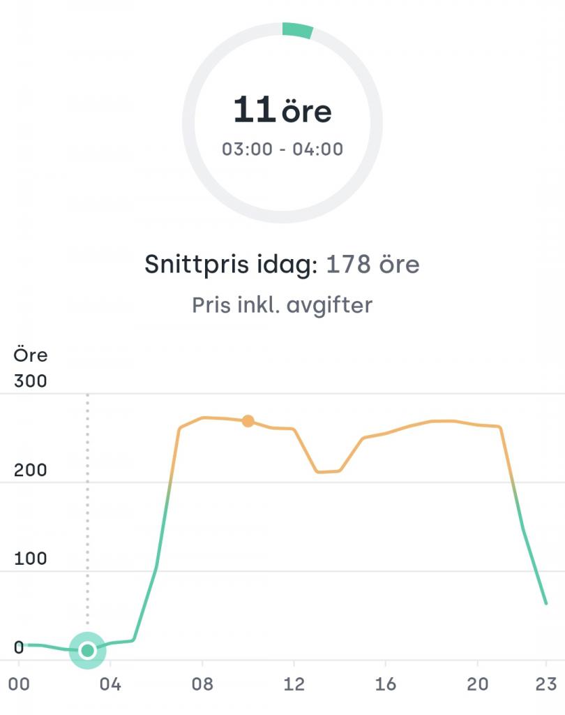 Om du kör smartladdning så betalar du aldrig mer än halva ditt snittpris för månaden så även om den går igång på dyra timmar behöver du inte känna stress över det.