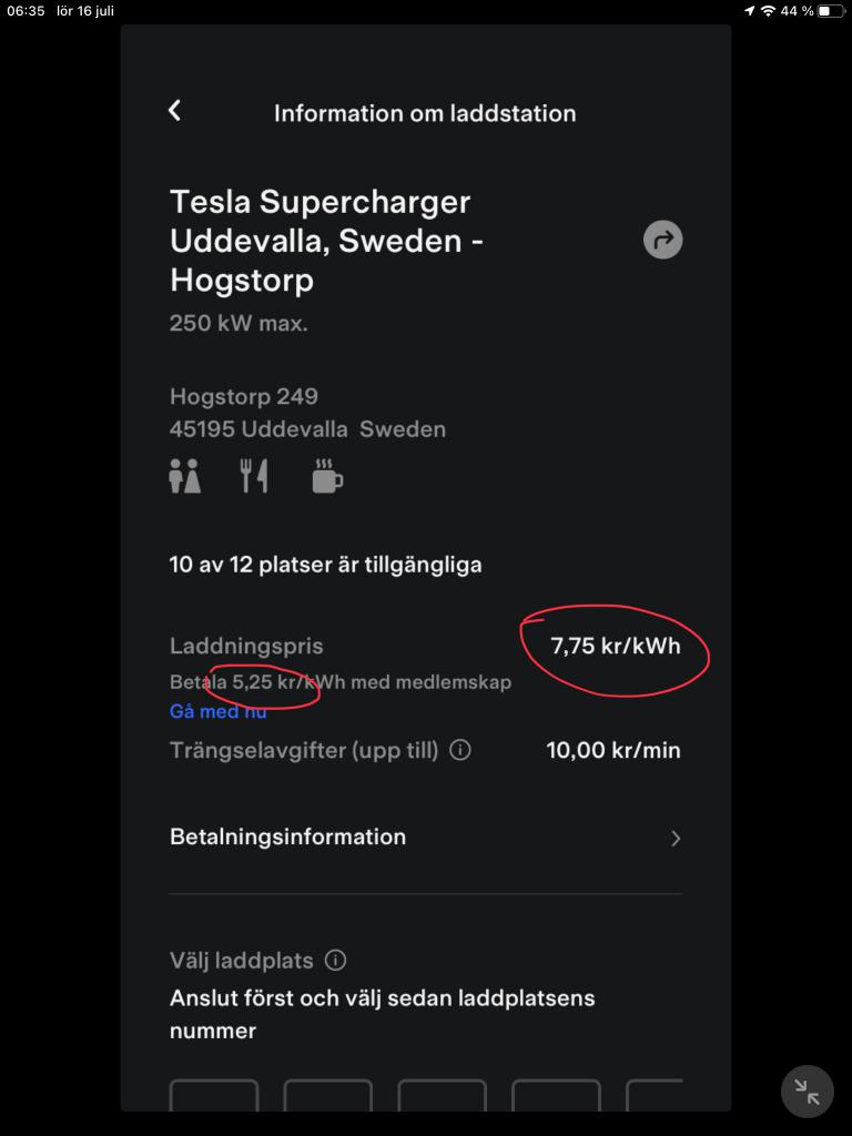Är det nån slags skämt med priserna på superchargers? Laddade för första gången igår. Kollade spotpriserna på el i Tibber-appen och eftersom det var blåsigt var spotpriset på el 6 öre/kwh. Det var en bil som laddade på hela stationen i Ulricehamn när vi kom. Medan vi laddade kom det en till. Så väldigt lågt tryck på stationen och absurt lågt elpris. Döm om min förvåning när priset för mig var 5,60/kwh. En av anledningarna för att köpa just Tesla var ju laddarna. Men med sån prissättning faller ju det argumentet ganska platt
