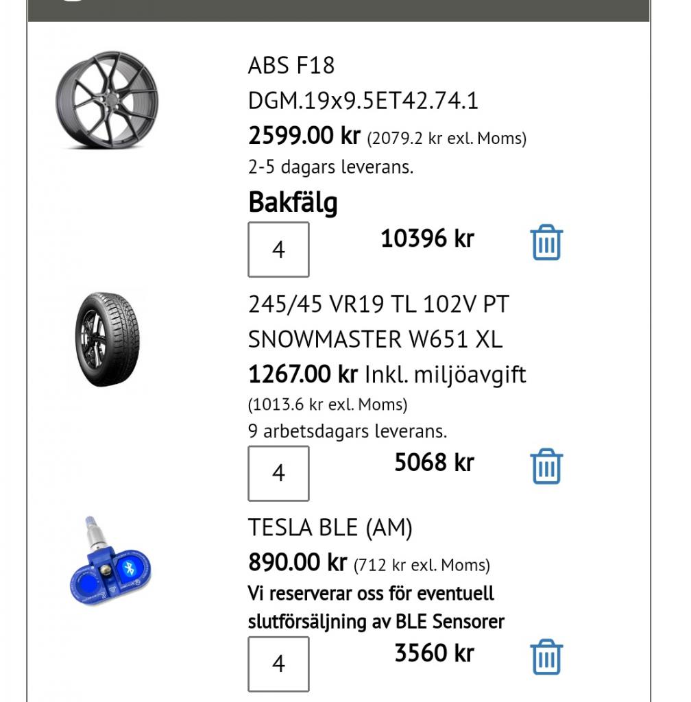 Jag hade inte beställt av dom eftersom dom finns på svarta listan. Dessutom bultarna som du ska använda får inte dras enligt Teslas rekommendationer.Mattias82 skrev:Dags att lägga en beställning på vinterdäck nu. Önskar då att fälgen inte sticker ut så som den gör på sommardäcken nu gör på min MYP. Min fråga är då: Vad är det jag skall kika efter i specifikation (antar att det är bredden) så gummit hamnar utanför fälgen. Tänkte lägga en beställning från https://www.abswheels.se/ Hört att folk har varit lite skeptiska till dom, men jag har även hört motsatsen.