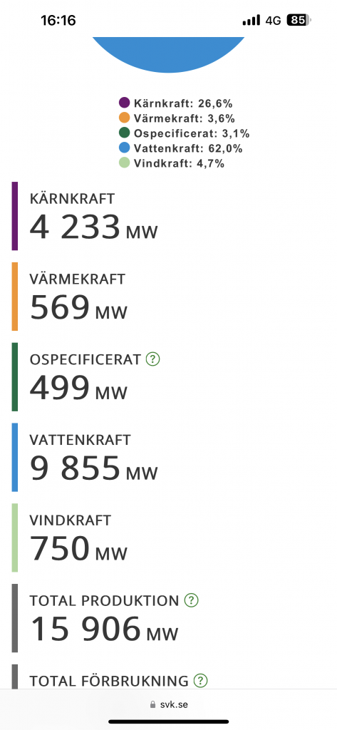 Jag ser gärna andra kraftslag är kärnkraft men samtidigt är jag stora nackdelar med gas, kol, olja, vind och sol. Vind och sol kan jag personligen tänka mig bygga ut lite till med den behövs parallelt kompletteras med något annat kraftslag som är mindre väderberoende. Då kommer man till den där frågan, vad finns de för alternativ kvar i se4 om man ska kompletera sol och vind med något mindre väderberoende..