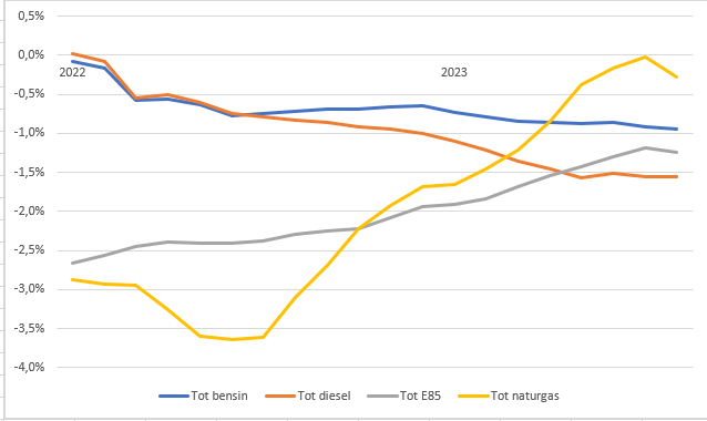 Det som går ner snabbast procentuellt för tillfället är dieslar men de är ändå bara 1,6% lägre än för ett år sedan.