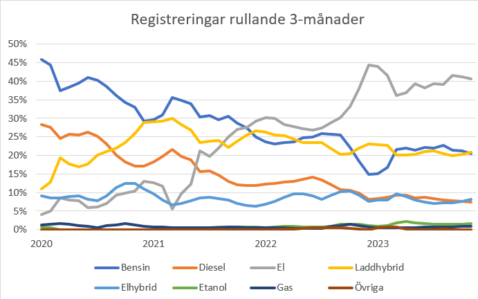 Kollar man på det längre tidsperspektivet som rullande 12-månader så har elbilar nu till slut gått över 40%, ska bli intressant och så om den tappar nu de kommande månaderna och i så fall hur mycket?